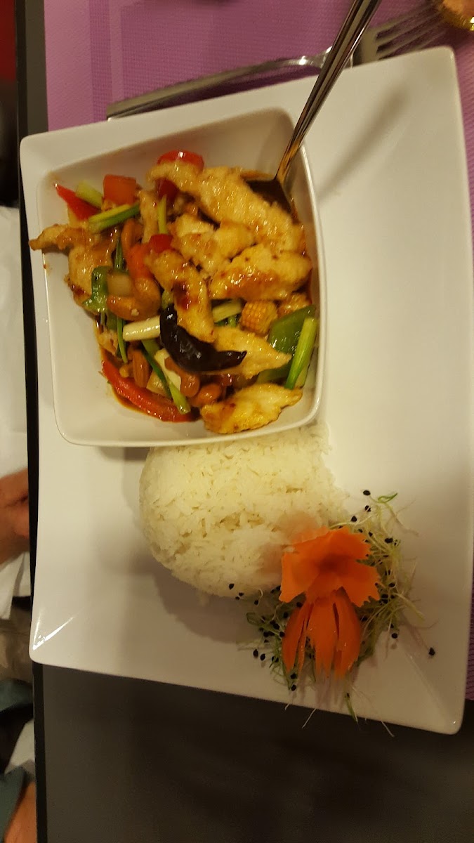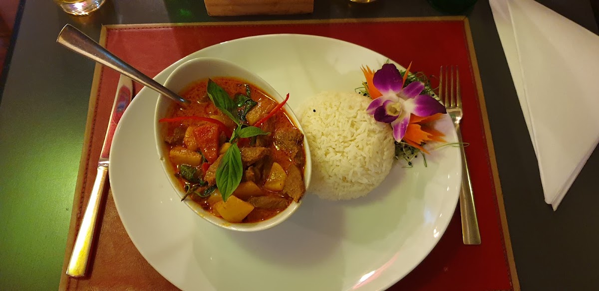 What really defines the experience here is the food. The menu focuses on well-loved Thai classics, prepared with care and bold flavors. One of the standout dishes is the Roter Curry Mit Gebratener Ente, where tender roasted duck is paired with a rich, aromatic red curry that balances heat and creaminess perfectly. It’s the kind of dish that fills the room with an irresistible aroma before it even hits the table.